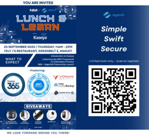 Join SageSoft Solutions, NMI, and Kaseya this September 25, 2025 (Thursday, 11 AM – 2 PM) at Fely J’s Restaurant, Greenbelt 5, Makati for an exciting Lunch & Learn on Cybersecurity, AI Automation, and IT Solutions.